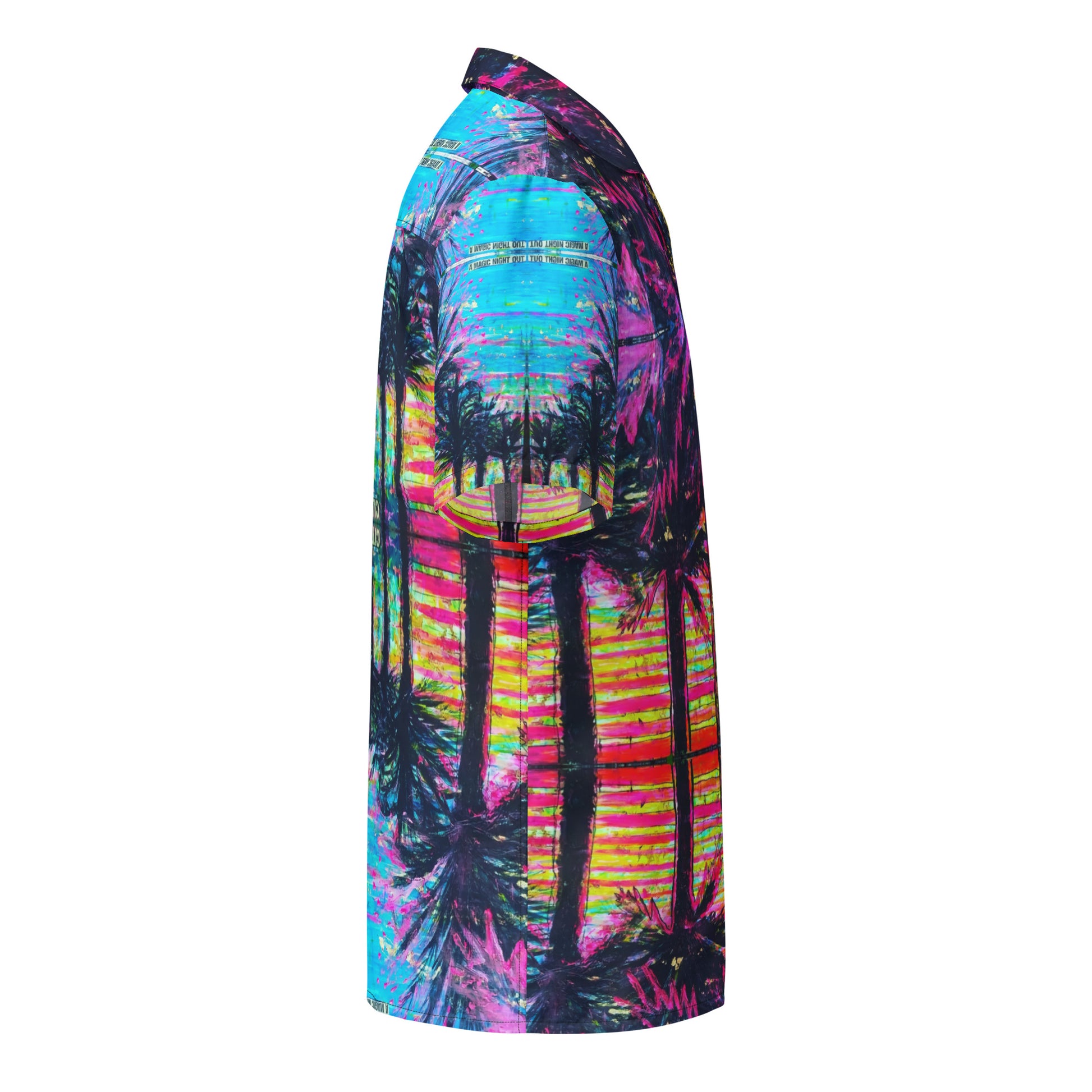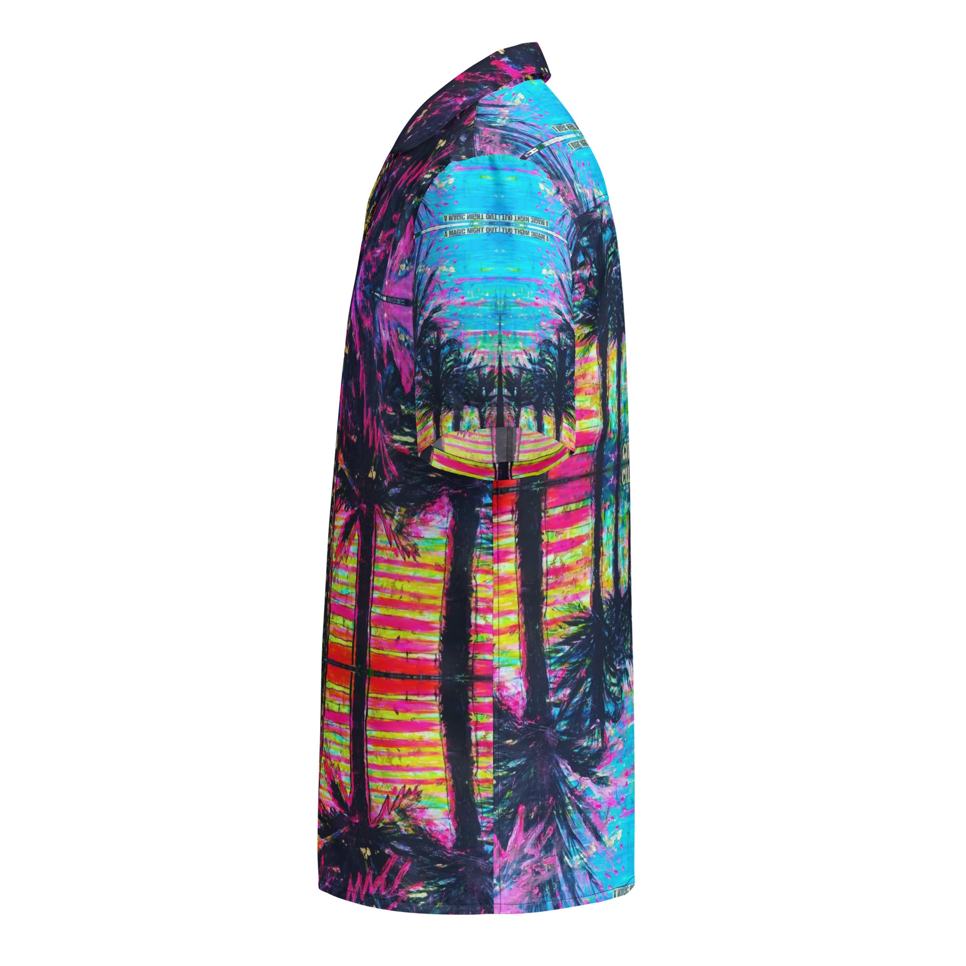 This relaxed-fit button-down features an energetic glitch-pattern print in neon acid pink, blue, and yellow—evoking memories of nights under city lights and carefree festival energy.