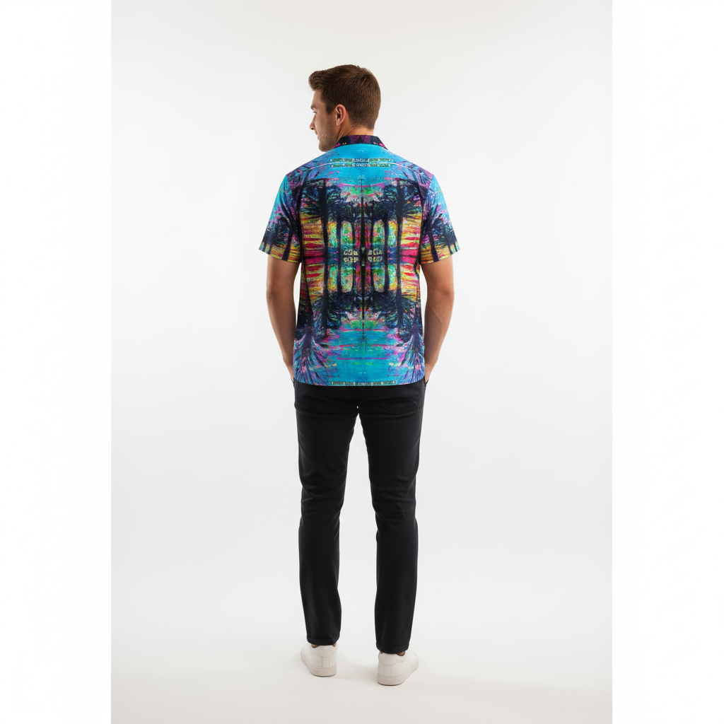 This relaxed-fit button-down features an energetic glitch-pattern print in neon acid pink, blue, and yellow—evoking memories of nights under city lights and carefree festival energy.