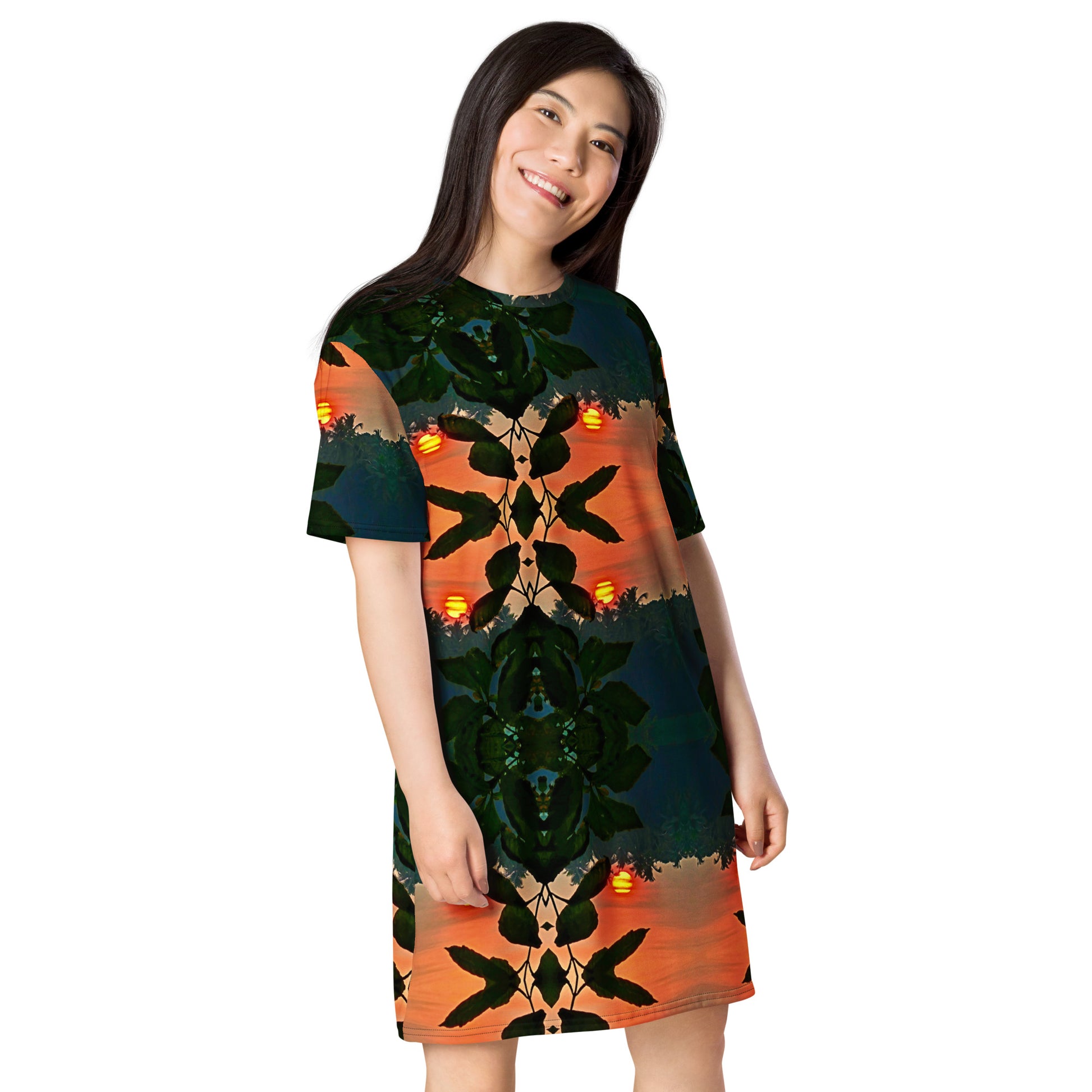 Slip into sunset with the Jungle Sunset T-Shirt Dress.