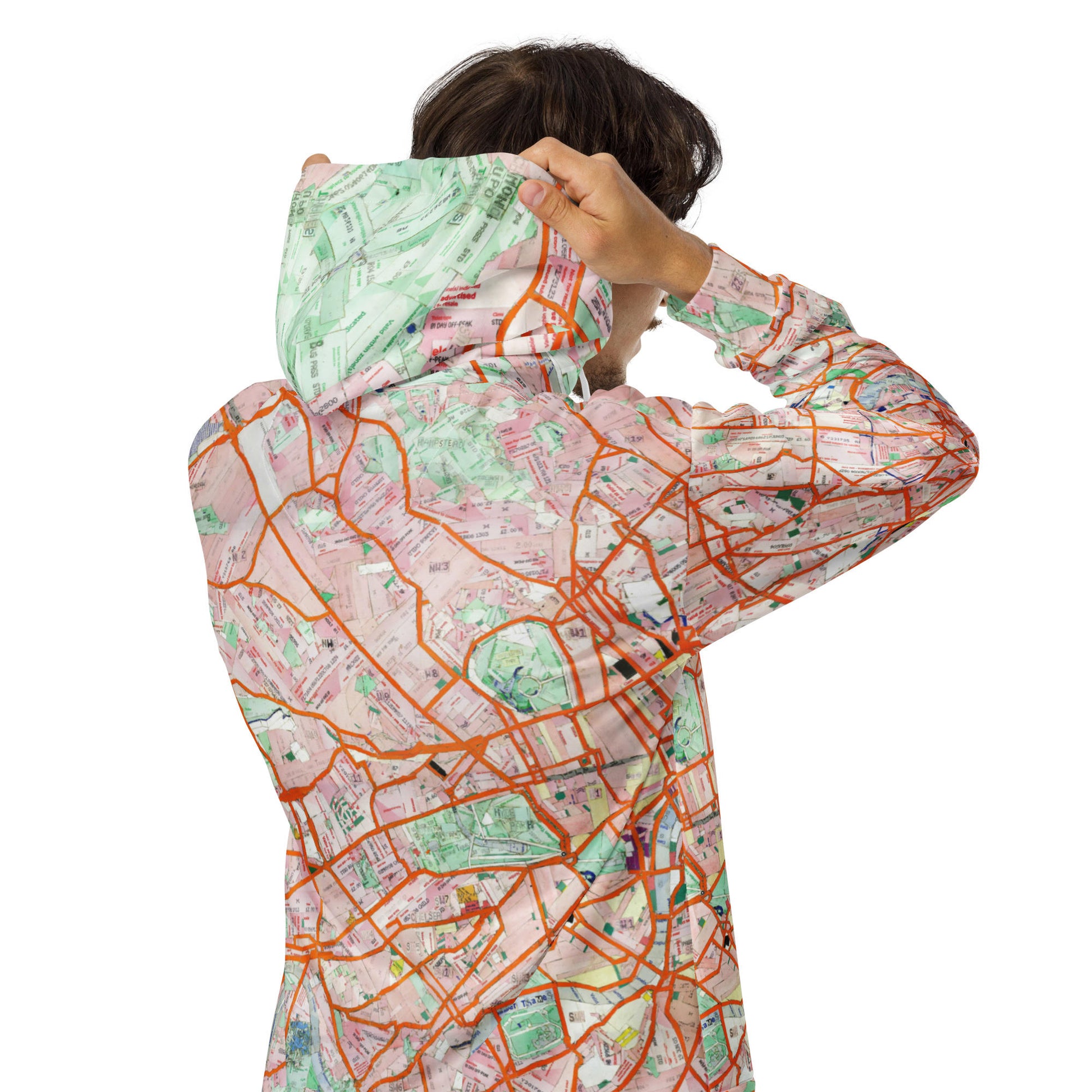 Featuring an all-over Travelcard map print of pre-2012 London, this zip-up map hoodie blends comfort with cartographic charm.