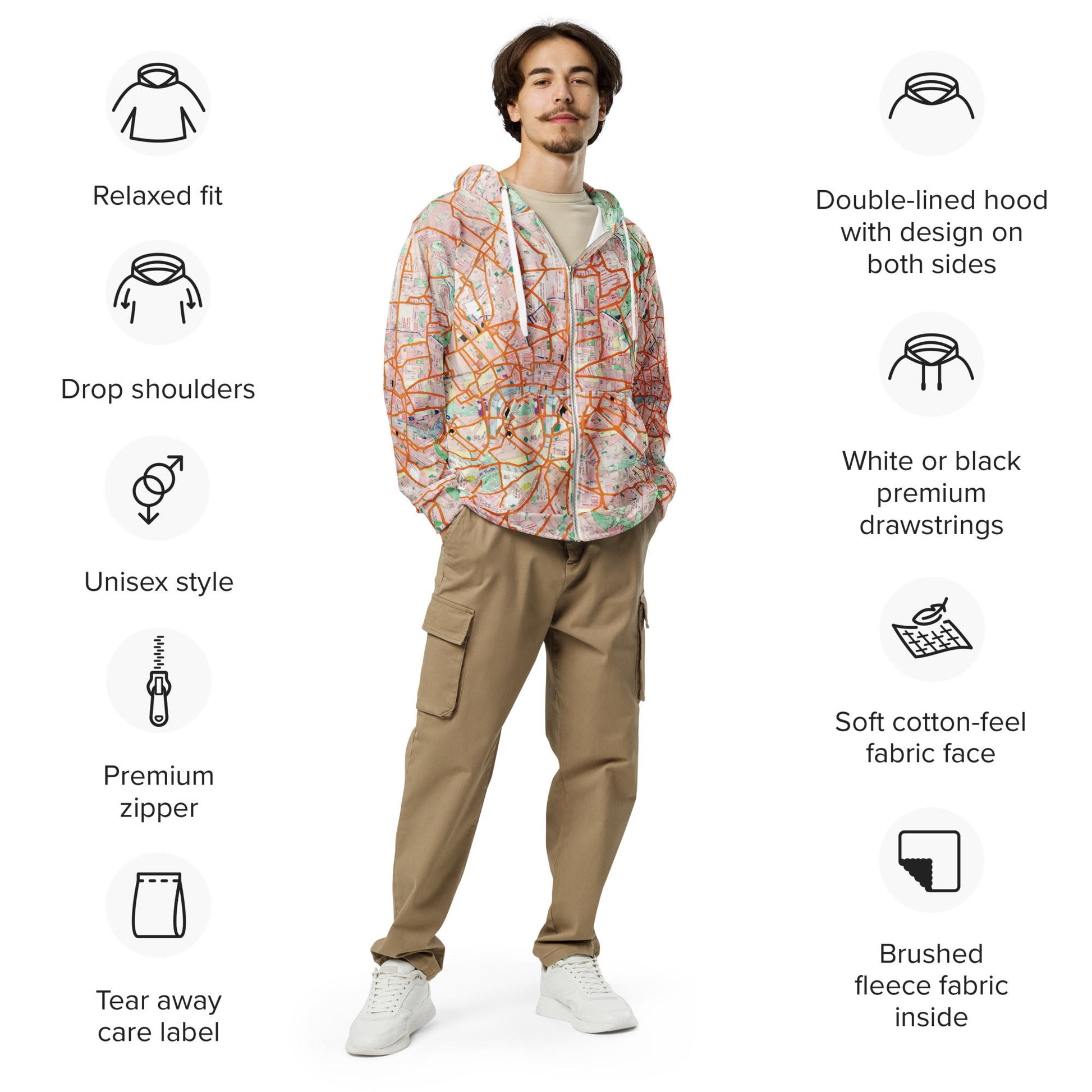 Whether you’re exploring the streets or relaxing at home, this London map zip hoodie is a unique, designer-inspired piece for your wardrobe. Soft both inside and out, this unisex hoodie offers a relaxed fit with drop shoulders. Plus, it’s designed to last, keeping you cozy and fashionable for years to come.