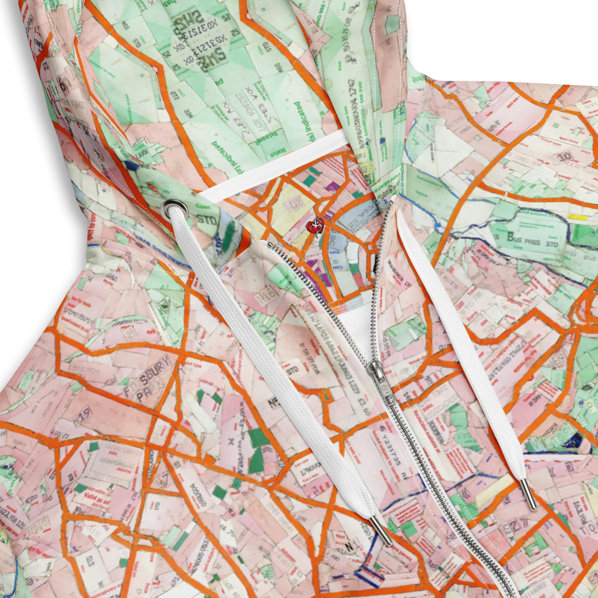 Featuring an all-over Travelcard map print of pre-2012 London, this zip-up map hoodie blends comfort with cartographic charm.